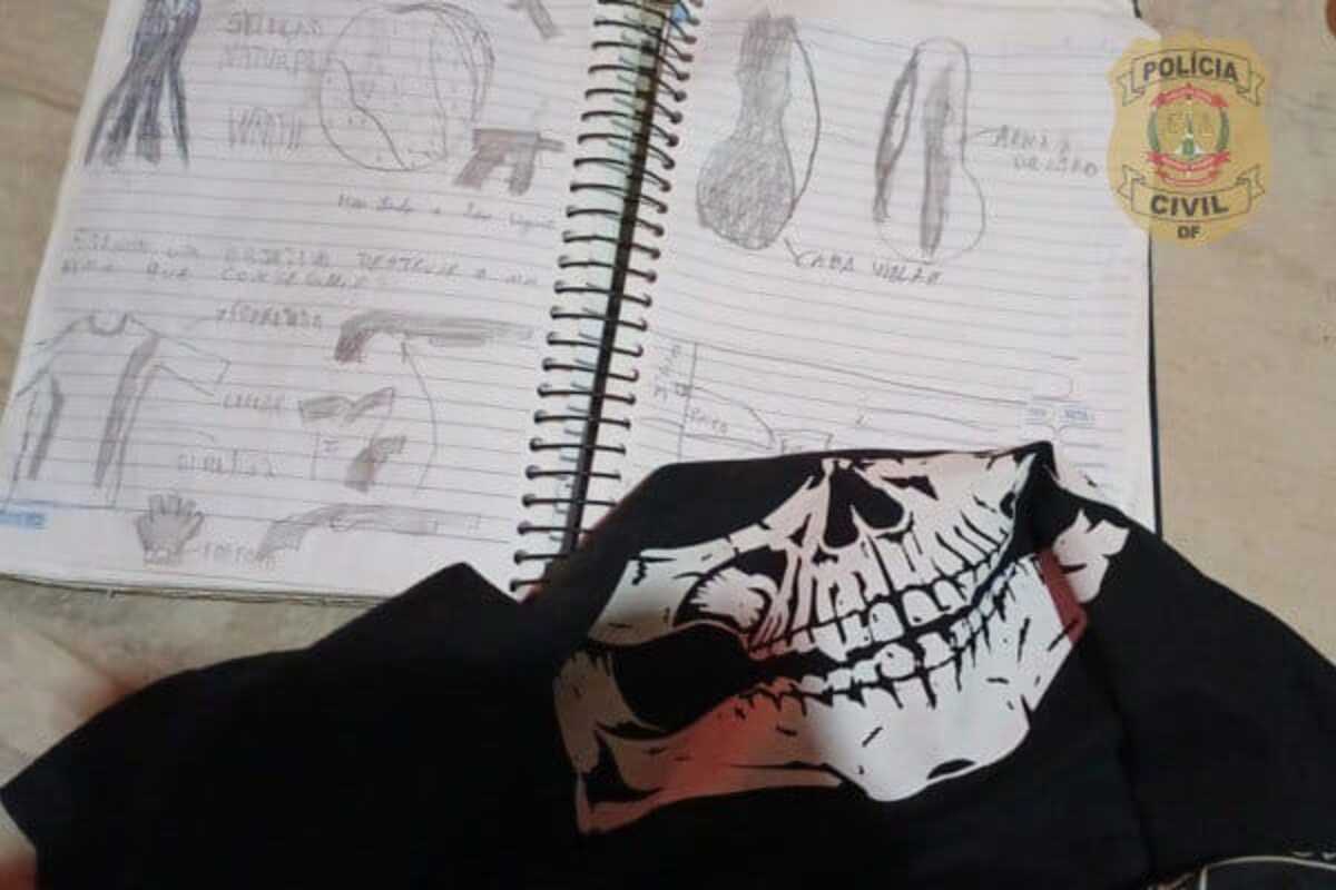 Dentre os materiais apreendidos divulgados pela PCDF, estão uma bandana de caveira e um caderno com desenhos de armas (foto em destaque).