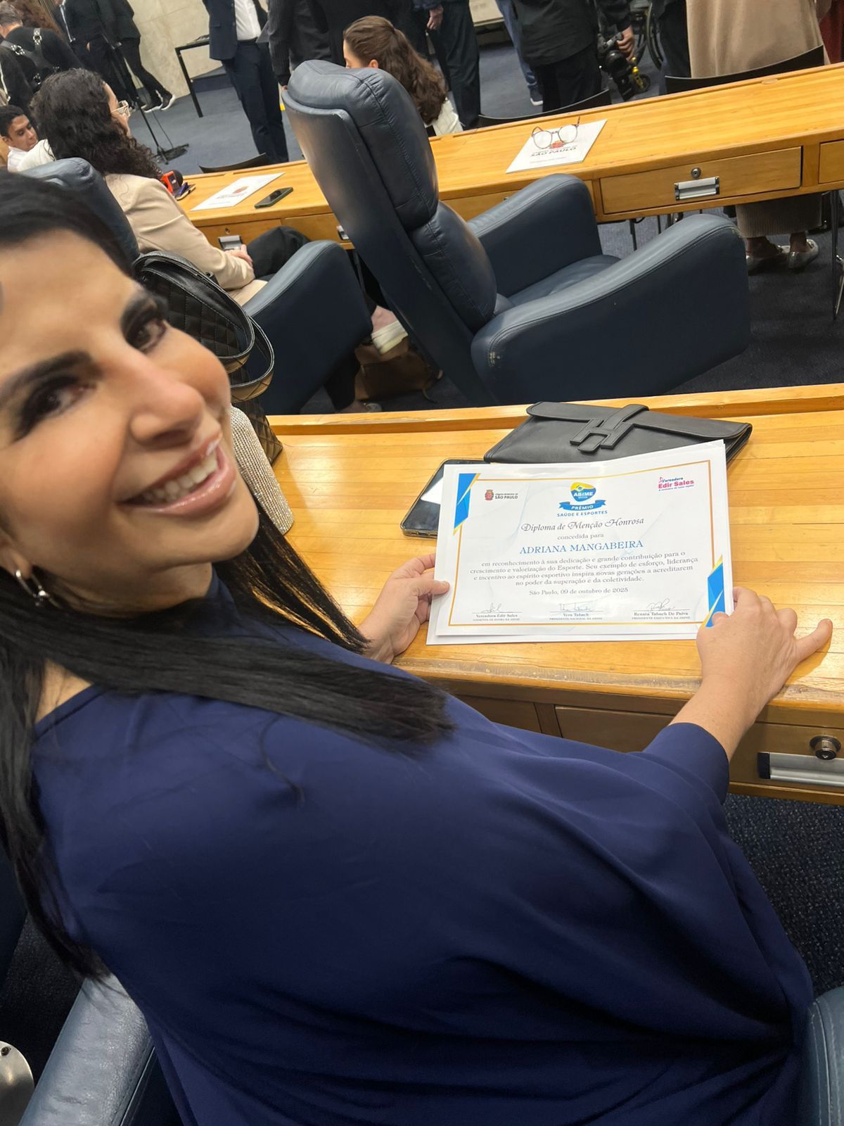 A advogada e triatleta Adriana Mangabeira recebeu, nesta quinta-feira (9), uma Moção Honrosa da Câmara Municipal de São Paulo, em reconhecimento à sua dedicação ao esporte e à promoção de hábitos saudáveis.