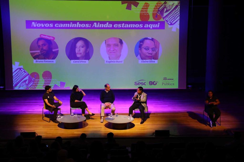 O debate, mediado por Bruno, que é jornalista e chefe de redação em São Paulo da Pública, contou com a presença do jornalista e professor da USP Eugênio Bucci, a jornalista e roteirista do documentário indicado ao Oscar “Democracia em Vertigem”, Carol Pires, além da sócia diretora na Alma Preta Jornalismo, Elaine Silva.