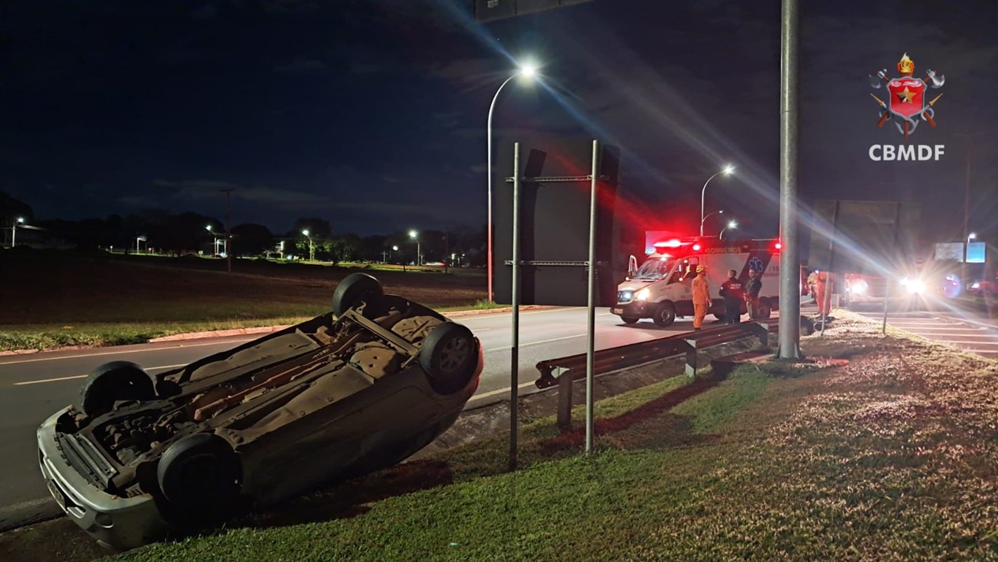 Carro capota perto do balão do Aeroporto de Brasília e interdita faixa. Veja vídeo