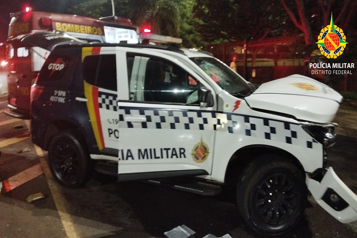 Carro com placa adulterada foge de abordagem e arrebenta viatura da PM