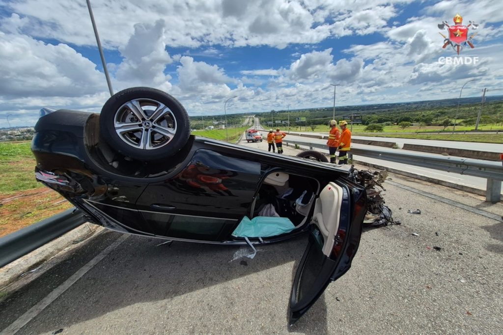 Carro de luxo capota e destrói barreira de proteção em acidente no DF. Veja vídeo