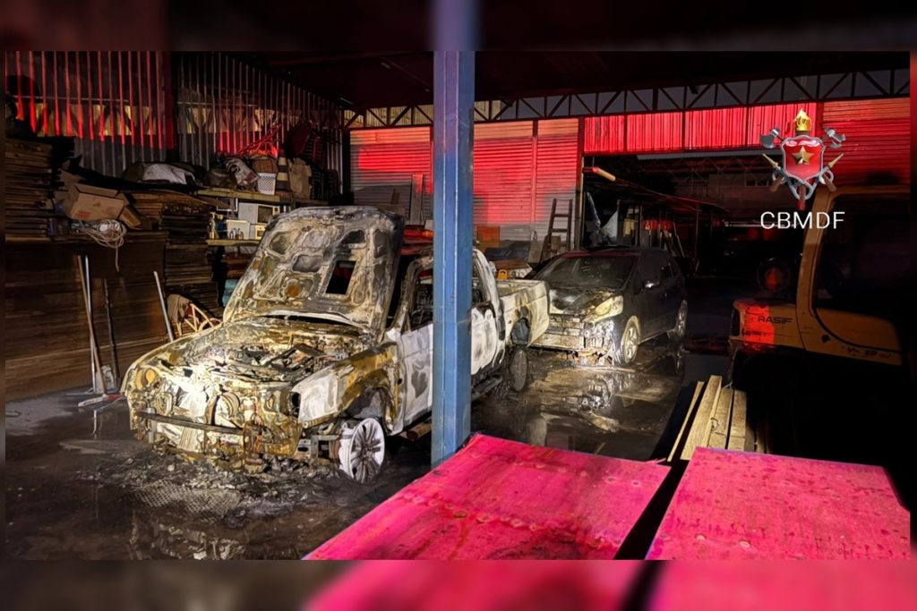 Carros são destruídos por incêndio dentro de madeireira no SIA. Veja vídeo
