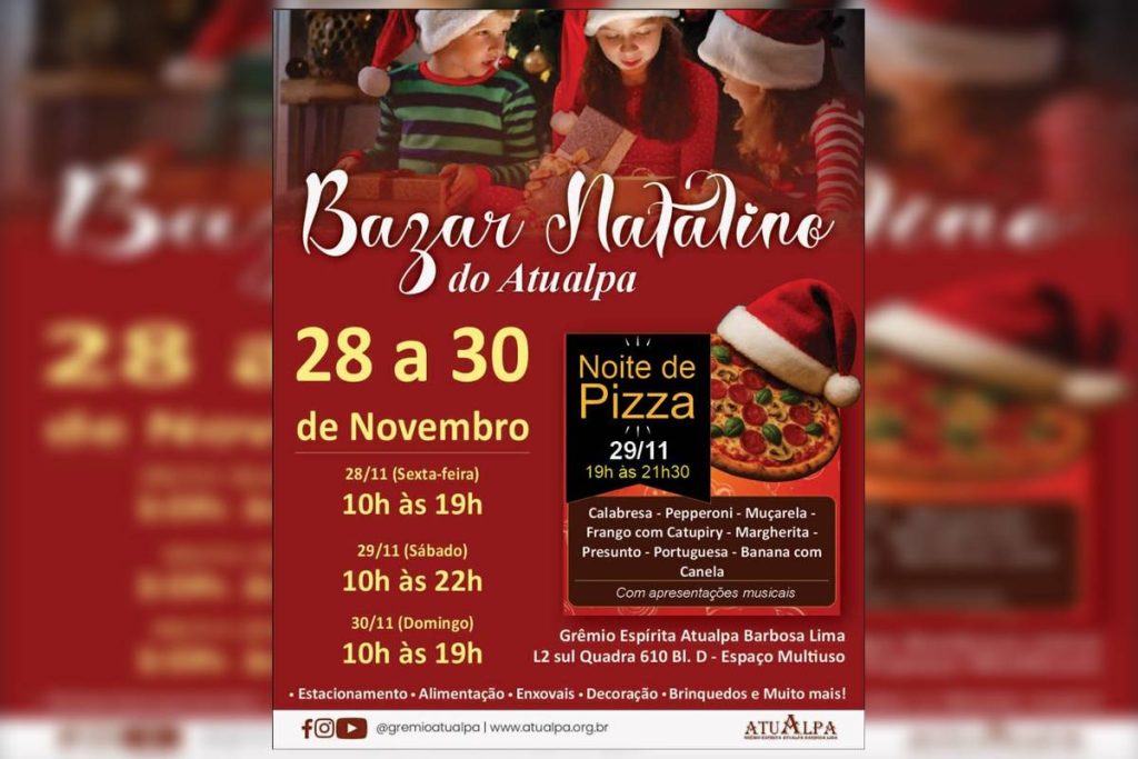Neste final de semana, o Grêmio Espírita Atualpa Barbosa Lima organizará um bazar natalino e noite de pizzas beneficente. Nos dias 28, 29 e 30 de dezembro, a renda de diversos produtos e atividades sociais será revertida para atividades sociais.