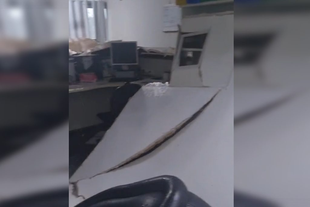 Imagens feitas no local mostram parte do teto no chão, canos estourados e água descendo pelas lâmpadas