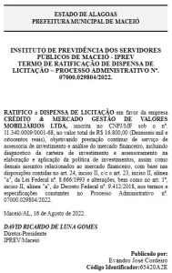 Em Maceió, a contratação foi feita por dispensa de licitação, no valor de R$ 16,8 mil, conforme publicação no Diário Oficial do Município em 16 de agosto de 2022. O contrato previa serviços de “assessoria de investimento e análise do mercado financeiro”, incluindo diagnóstico da carteira e elaboração da política de investimentos do instituto.