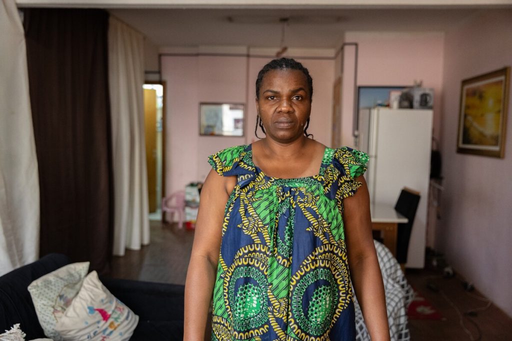 A refugiada Elisa José, 42 anos, que vive há quase dez anos no Brasil com três filhos, é uma das moradoras do prédio. Nem todos os apartamentos possuem banheiro, e as pessoas precisam dividir os lavabos adaptados com chuveiro no corredor. Por ser uma das moradoras antigas — ela está no Granjal desde 2022 — conseguiu fazer um puxadinho, anexando o banheiro ao dormitório.
