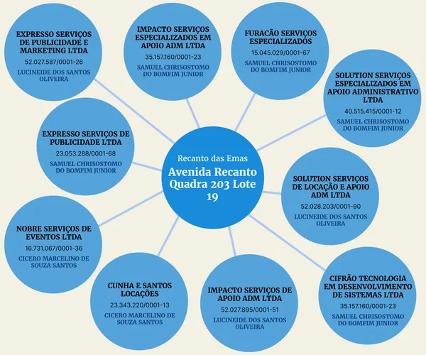Um desses empreendimentos, nomeado como Solution, foi aberto por Samuel Chrisostomo do Bomfim Junior – contador da Conafer, e supostamente funciona no mesmo local de uma Igreja Evangélica, fundada por uma das sócias da AAB, identificada como Lucineide dos Santos Oliveira, no Recanto das Emas.