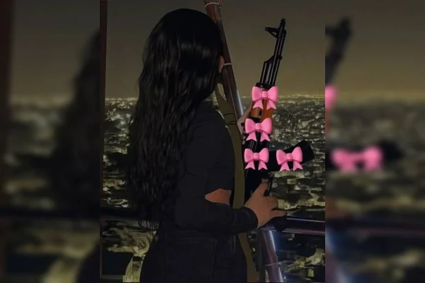 Ela estava vestida com roupa camuflada e colete tático, preparado com espaços para carregadores de fuzil, o que confirma seu papel ativo na linha de frente da facção.