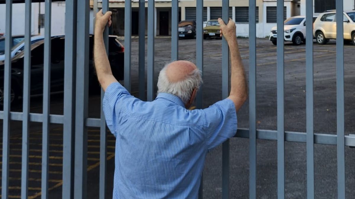 E assim, em um dia bonito de outono em São Paulo, fotografei José de costas no instante exato de sua comunhão silenciosa. De cabelos brancos e escassos, vestindo uma camisa social azul de mangas curtas, suas mãos calejadas agarram com firmeza as grades cinzentas e espessas do portão do antigo porão ditatorial. Ele olha para dentro, para o pátio vazio e para os prédios de janelas basculantes que guardam tantos ecos. Atrás das grades, o passado; Vlado e tantos outros, do lado de cá, um homem que não esquece.