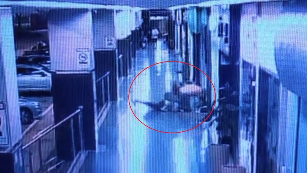 Com o homem já no chão, os agressores continuam, até que um deles o chuta de uma escada de, aproximadamente, seis degraus.