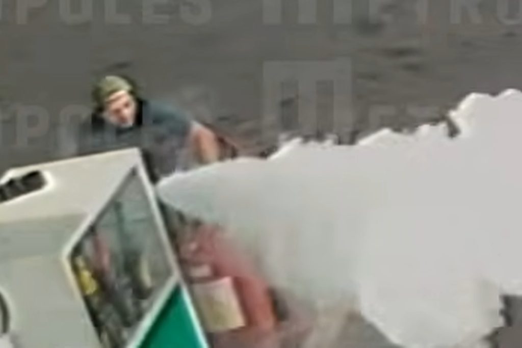 Câmeras de segurança do posto de combustíveis flagraram um dos motoristas espalhando gasolina pelo local e abrindo um extintor de incêndio