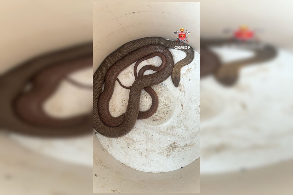O Corpo de Bombeiros Militar do Distrito Federal (CBMDF) resgatou, na tarde desta quarta-feira (28), uma cobra que apareceu dentro de um carro em um centro automotivo localizado atrás da Feira do Produtor, em Ceilândia.