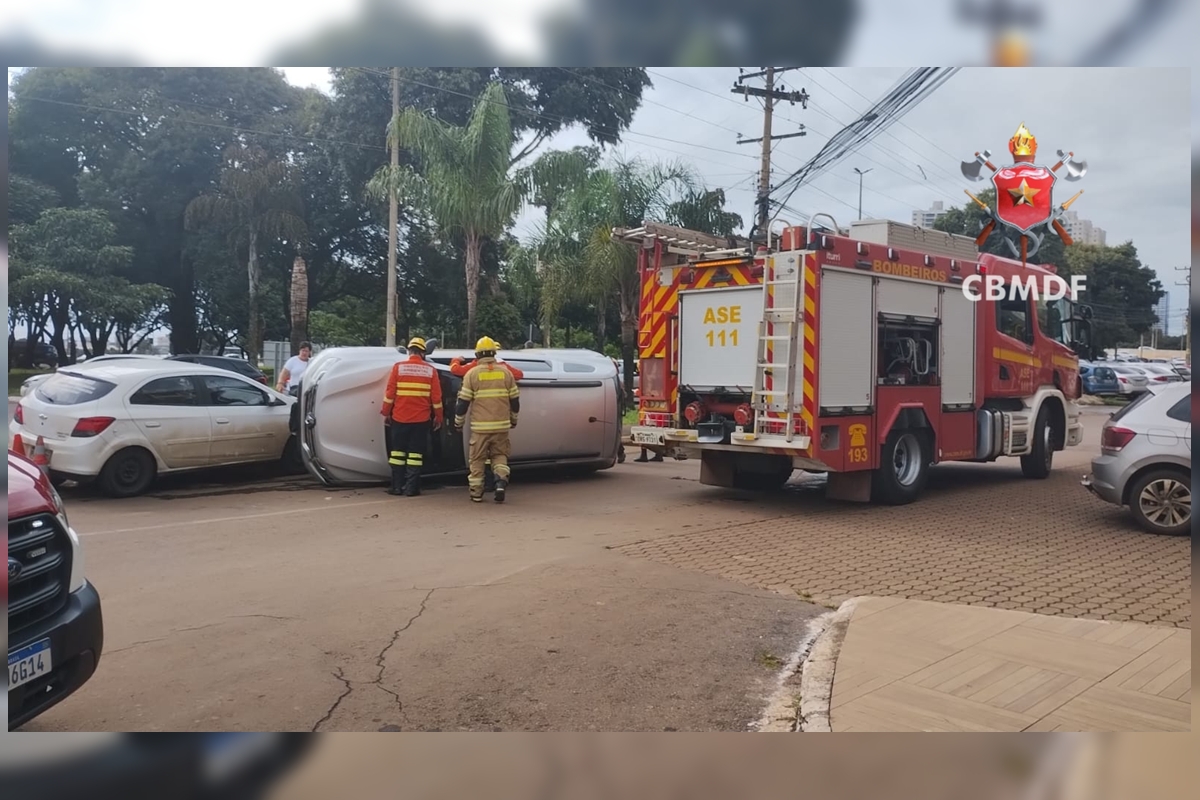 Taguatinga: após acidente, carro tomba e interdita avenida