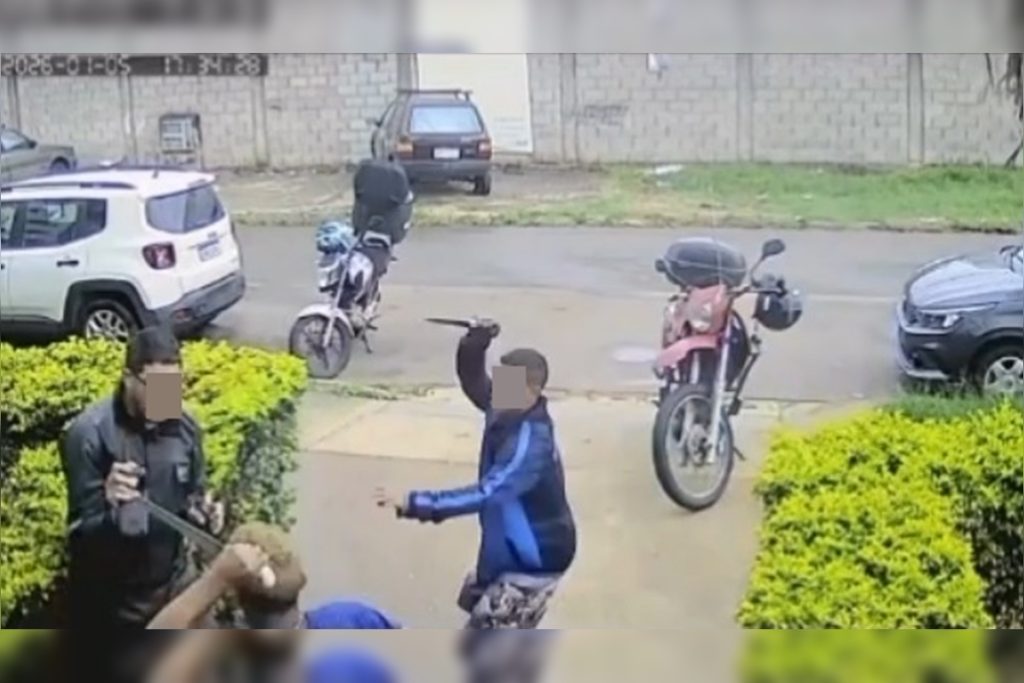 No vídeo, um dos autores pega o que parece ser uma marmita da mão do motoboy, e a dupla tenta fugir na moto da vítima em seguida