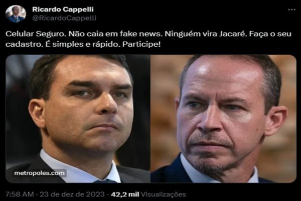 Neste sábado (23/12), o secretário-executivo do Ministério da Justiça e Segurança Pública, Ricardo Cappelli, compartilhou o elogio do senador Flávio Bolsonaro ao aplicativo Celular Seguro. Na publicação, Cappelli escreveu: “Não caia em fake news. Ninguém vira Jacaré”.