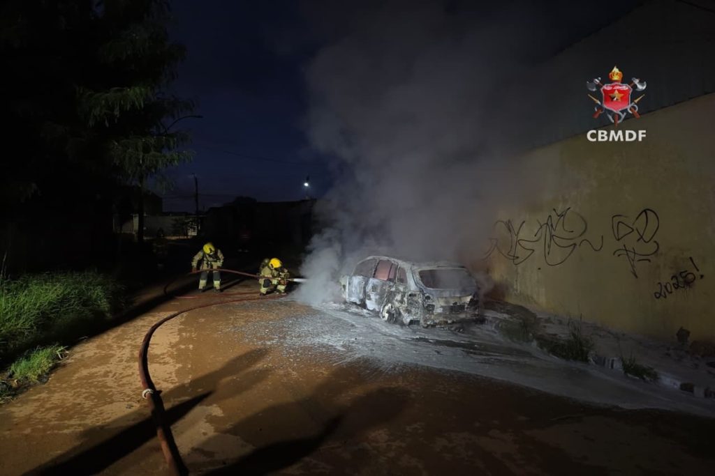 Carro pega fogo na entrada de condomínio e mobiliza bombeiros no DF