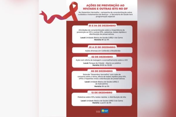 Dezembro é o mês dedicado especialmente ao combate à Aids. Os moradores de Brasília contarão com testes rápidos e distribuição de preservativos, além de diversas atividades voltadas para prevenção e conscientização da população sobre a doença e outras Infecções Sexualmente Transmissíveis (ISTs). Ao longo deste mês, a Secretaria de Saúde do Distrito Federal (SES-DF) promoverá ações para esclarecimento sobre a doença e combate ao estigma associado ao tema.