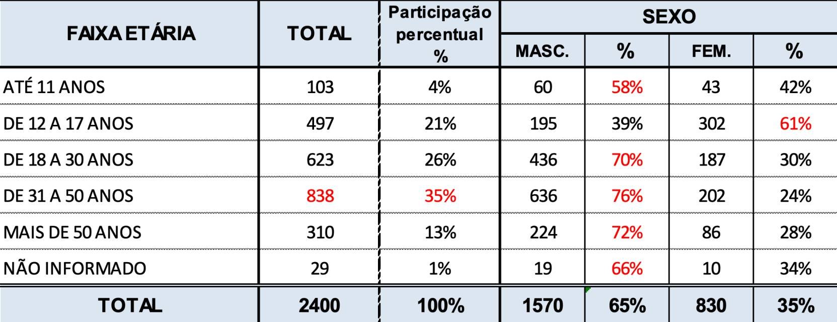No ano passado, a faixa etária predominante entre os desaparecidos era de 31 a 50 anos, que correspondeu a 35% dos casos. Em relação ao sexo, 65% eram do homens, e 35%, mulheres.