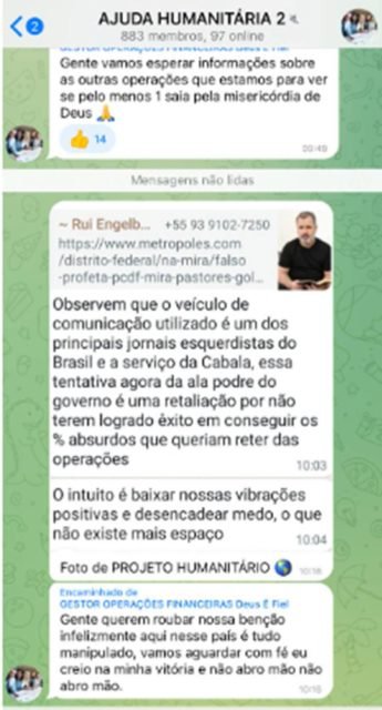 A coluna teve acesso a um print das conversas que rolam nos grupos. Um dos criminosos é direto em afirmar que todos deveriam acreditar no pagamento. “Gente, vamos esperar informações sobre as outras operações que estamos para ver se pelo menos 1 saia pela misericórdia de Deus” diz um dos golpistas.