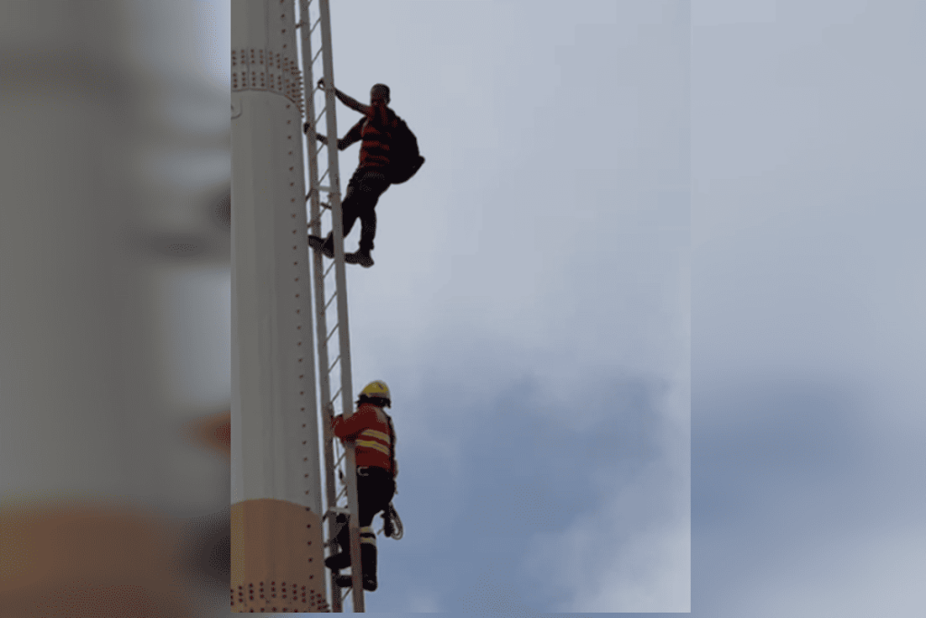 No vídeo do desfecho (assista acima), gravado perto das 15h, ele aparece nas escadas vestindo uma camiseta preta e vermelha e carregando uma mochila, enquanto um profissional acompanha a descida para evitar um acidente.