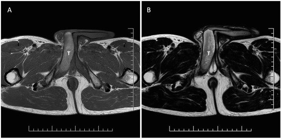 Exames de imagem revelam a zona do pênis atingida pela trombose, marcada com um T, e a ereção em tom mais claro