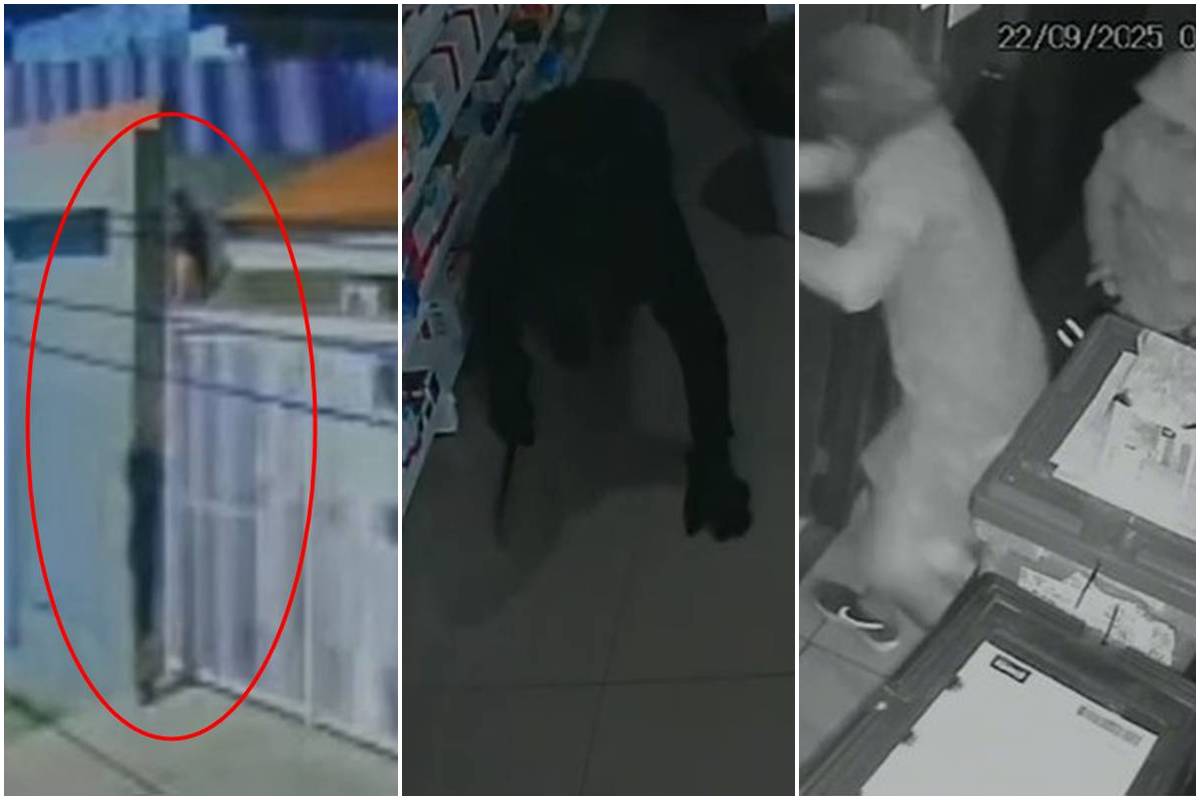 As imagens das câmeras de segurança mostram o momento em que os dois bandidos invadem a farmácia pelo telhado do estabelecimento comercial. Dentro do local, eles se arrastam pelo chão  e começam a pegar os medicamentos. Em seguida, os criminosos vão até o cofre da drogaria e furtam o dinheiro que estava lá.
