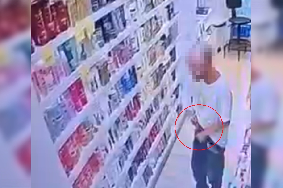 Câmeras de segurança da farmácia mostram que o homem furtou três produtos. Ele foi localizado na Ponte do Bragueto