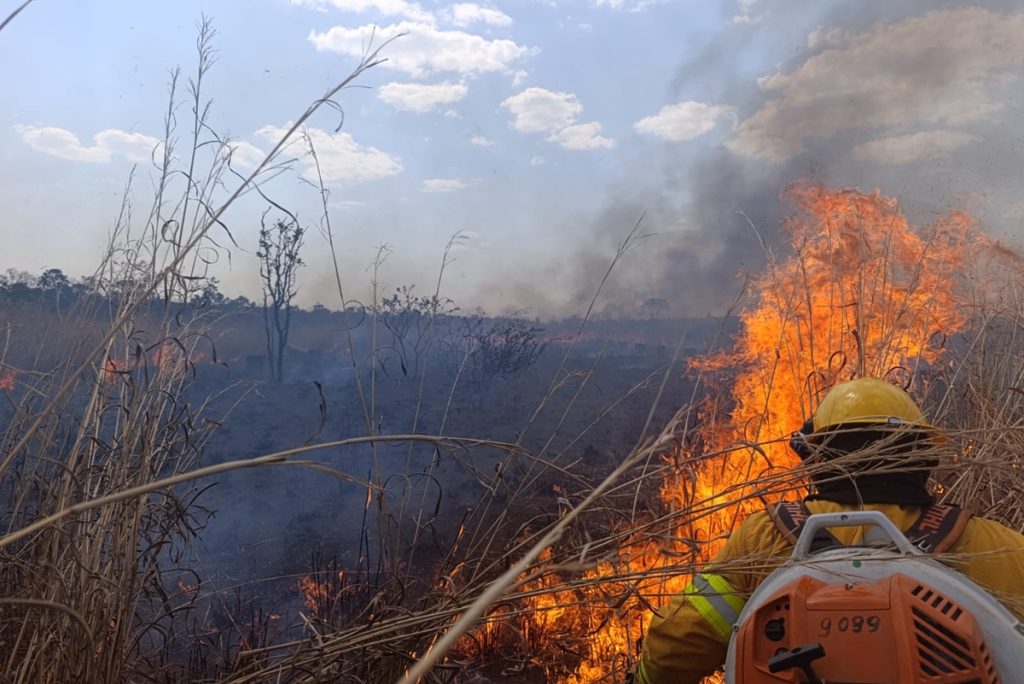 Bombeiro durante combate ao fogo em área de Cerrado