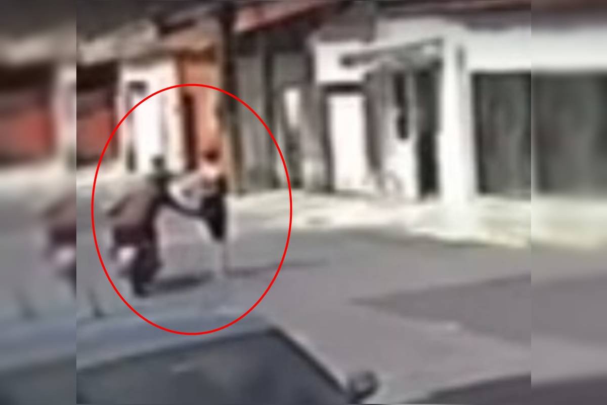 Nas imagens, o homem para a moto ao notar que a vítima atravessaria a rua. Após ela passar, ele se aproxima e a apalpa.