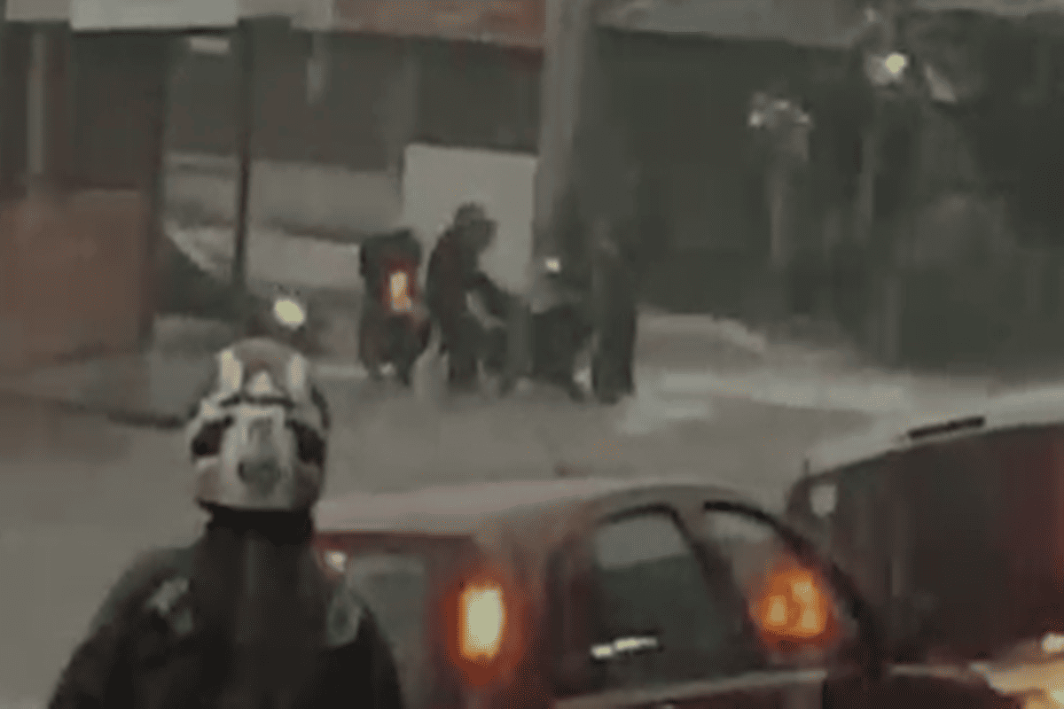Motociclista escapa por pouco de ser arrastado por enxurrada durante temporal. Veja vídeo