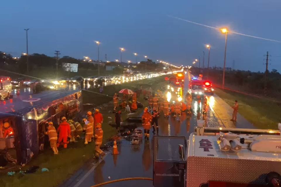 O ônibus de turismo que capotou na BR-070 no início da noite deste sábado (21/10), matando ao menos 5 passageiros e deixando outros 14 feridos, estava irregular e era escoltado pela Agência Nacional de Transportes Terrestres (ANTT) no momento do acidente. O Metrópoles apurou que, momentos antes de tombar no canteiro central da rodovia, o motorista acelerou o veículo, na intenção de fugir dos fiscais da agência reguladora, momento em que perdeu o controle da direção.