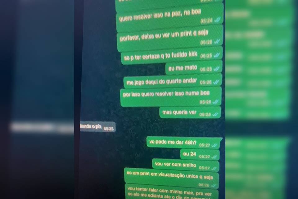 A vítima de extorsão pagou uma quantia de R$ 200 via Pix e informou que pagaria o restante no dia seguinte. Pela manhã, o homem registrou uma ocorrência na 5ª Delegacia de Polícia e, ainda durante o atendimento policial, o suspeito exigiu o pagamento. Veja a troca de mensagens: