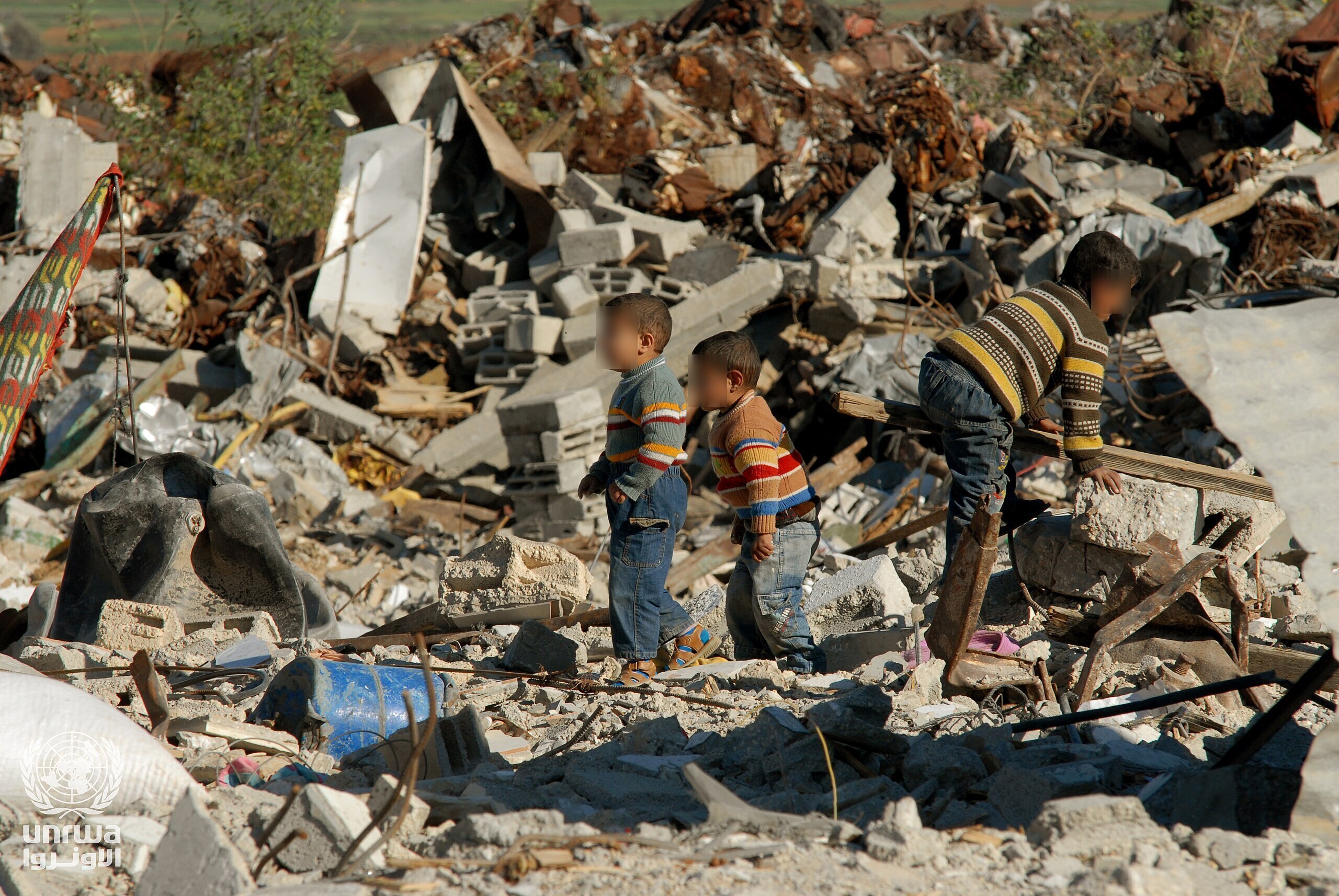 Recolhe a sucata em sua sacola improvisada e anda muito até chegar ao pequeno alojamento no campo de refugiados.