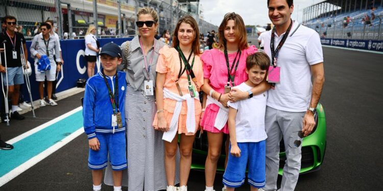 Federer com a esposa Mirka e os filhos / Clive Mason – Formula 1/Formula 1 via Getty Images