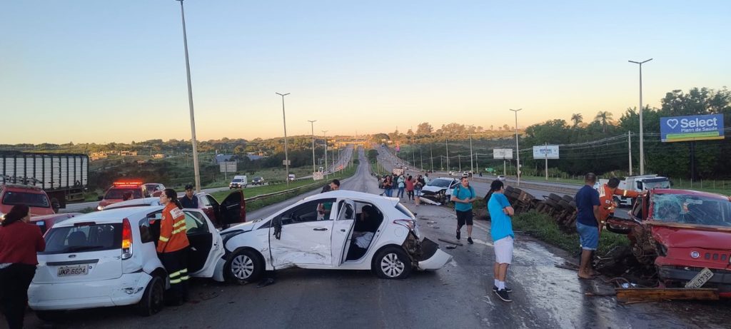“Susto grande”, diz passageiro sobre acidente com caminhão e 12 carros. Vídeo