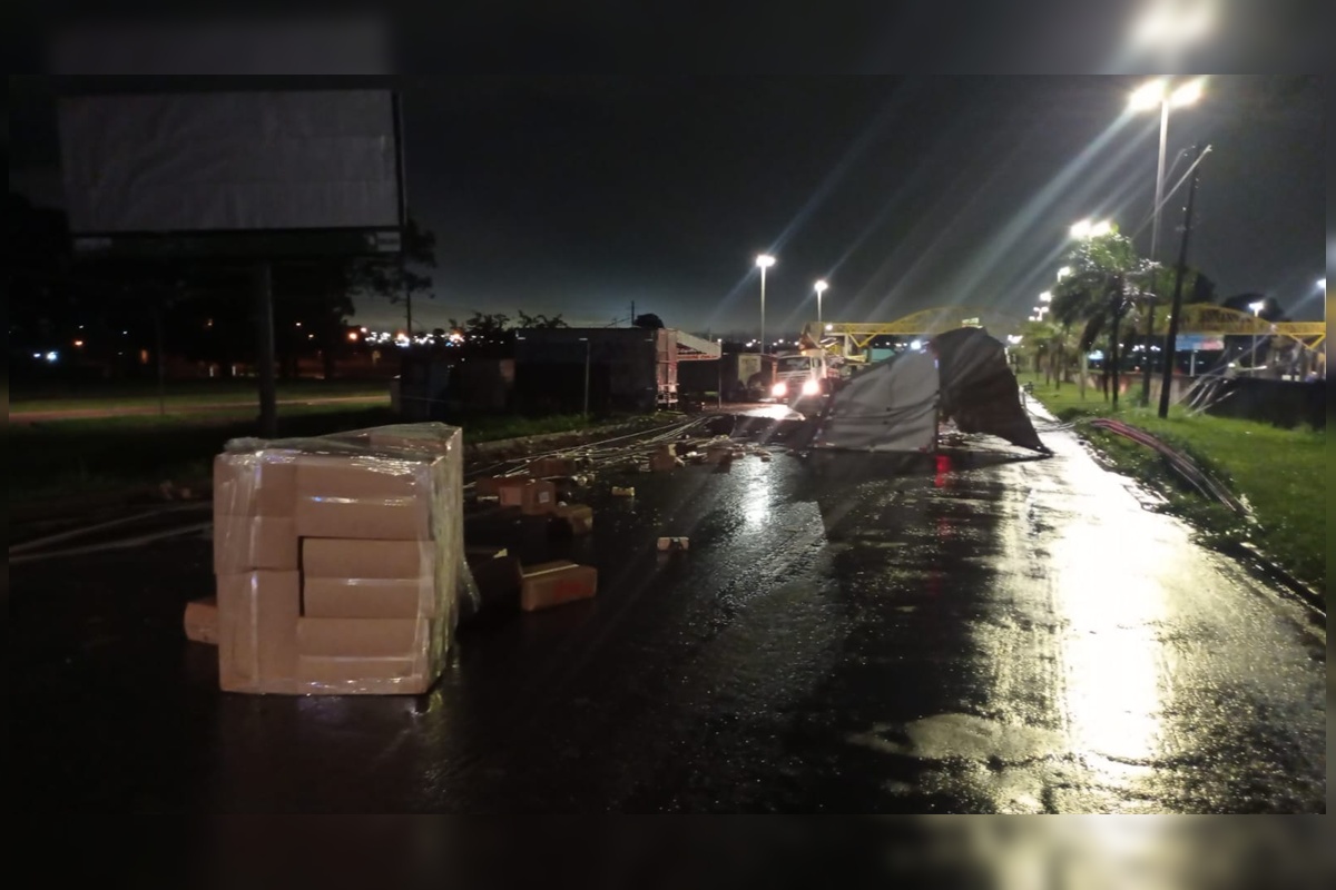 Trecho da DF-001 permanece fechado após caminhão derrubar postes. Veja vídeo