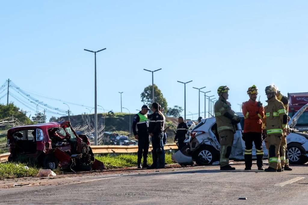 Trecho da Epia Norte é liberado após acidente com 12 carros e caminhão. Veja vídeo