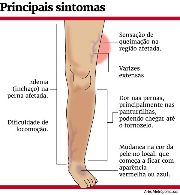 A trombose é a formação de um coágulo, uma espécie de solidificação do sangue, onde não houve ferimentos. Este coágulo dificulta a circulação na região, levando a inchaço, vermelhidão, sensibilidade e dores.