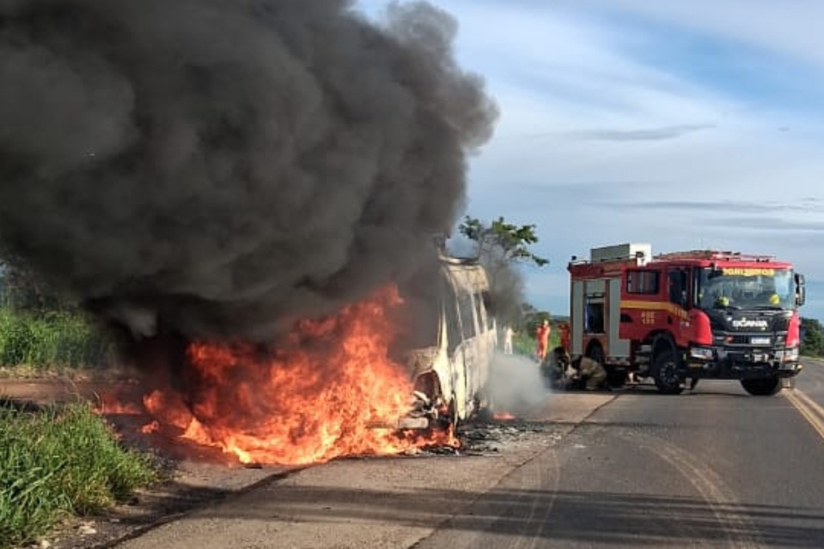 Van fica completamente destruída após pegar fogo em rodovia do DF. Veja vídeo