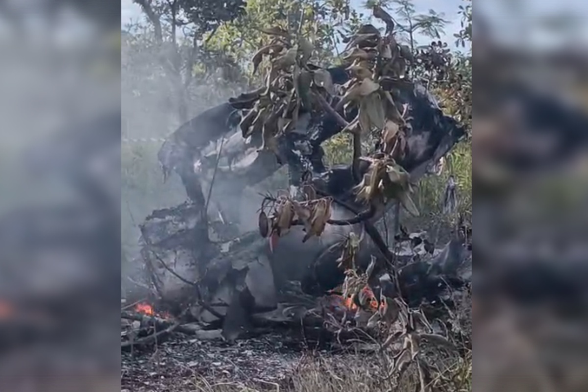 As imagens mostram a aeronave completamente destruída, enquanto alguns focos de incêndio ainda estão ativos